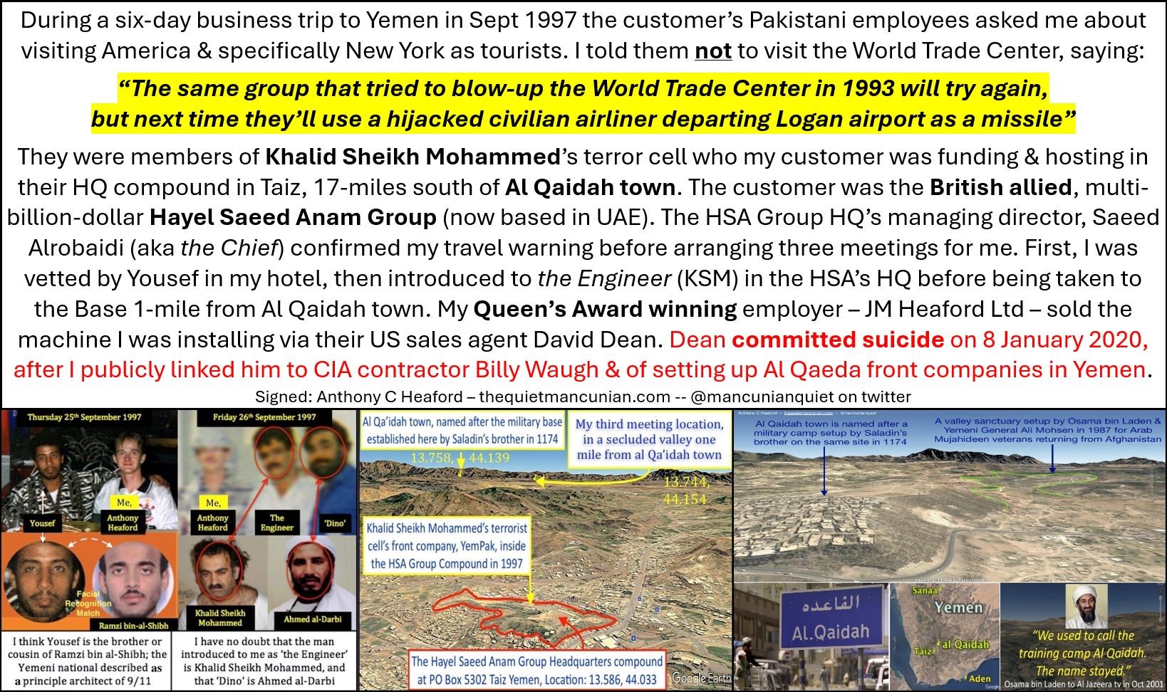September 1997: When employed as a field service technician by a Queen's Award winning British engineering export company (JM Heaford limited) I was sent to install printing machinery in a supposedly new customer's factory in Yemen. The new customer turned out to be Khalid Sheikh Mohammed’s terrorist cell's front company called YemPak (Yemen-Pakistan abbreviation), located inside an existing customer's headquarters compound in Taiz, 17-miles south of Al Qaidah town. KSM's hosts were the British allied, US supplied, multi-billion dollar Hayel Saeed Anam (HSA) Group. I was vetted over dinner at my hotel by Yousef before being introduced to the Engineer (KSM) by HSA's managing director Saeed Alrobaidi, aka the Chief. HSA's general manager Mohamed then took me to an unscheduled meeting one mile from Al Qaidah town - it was a recruitment interview that I cut short before it'd even begun. Those meetings occurred after KSM's Pakistani chemical engineers who I was training asked me about visiting New York as tourists. I repeated a warning I'd first given to a customer in Toronto on 12 June 1997 after flying there from Boston's Logan airport. I explained my fear of the 1993 World Trade Center (WTC) bomb group trying again but next time using a hijacked plane as a missile. My advice to them was not to visit the WTC and to resist any hijacking attempts, even highlighting box-cutters as an easily carried potential weapon. On 8 January 2020 JM Heaford Ltd's former US sales agent David Dean (a 101st Airborne Vietnam veteran of Hamburger Hill) killed himself by drowning in Lake Hartwell after I tweeted about his links to CIA contractor Billy Waugh (who admitted working with Al Qaeda operators in 1990s Yemen), and saying Dean set up the machine sale to Yemen at an industry exhibition in Chicago on 14 April 1997.
