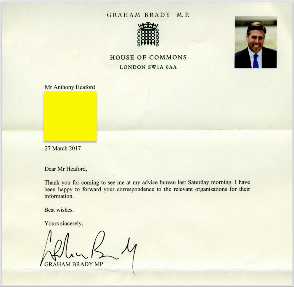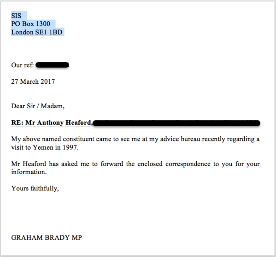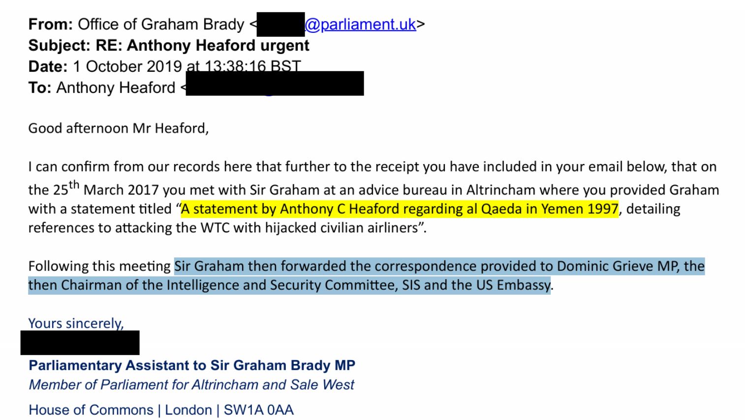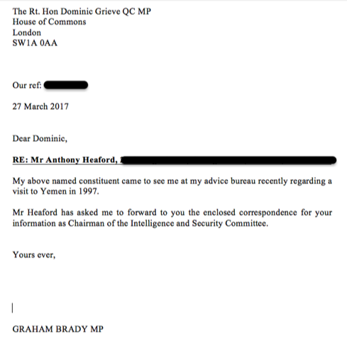 October 01 2019: Sir Graham Brady provides a confirmation that my reports about meeting Al Qaeda in 1997 Yemen had been shared with the US Embassy, parliament's Intelligence & Security Committee, & SIS. The Prevent 'councellor' Sina Desai told me she didn't care about Sir Graham Brady's email & continued to demand to interview me.