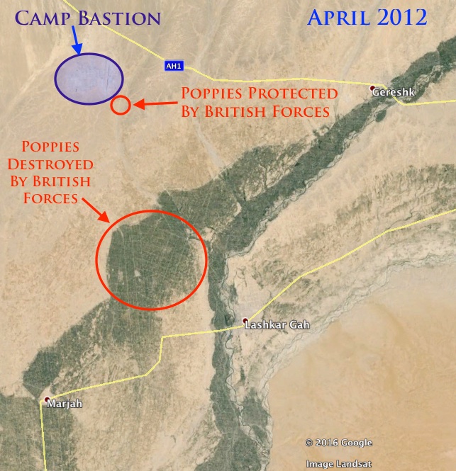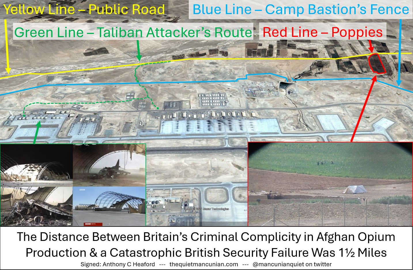 Tactical: From a soldier’s point of view the principle consequence of our complicity in opium production by Camp Bastion was that Taliban allies posing as migrant labourers could spend weeks living just two hundred metres from our base’s perimeter fence, mapping the airfield, noting aircraft movements, guard patterns and the like. That’s confirmed by the British and American generals I’ve quoted above who admit it contributed to the success of the Taliban’s September 2012 airfield raid (that was originally planned for July). Therefore on a tactical level the main cost of Britain’s criminality was borne by the US Marine Corp. They suffered two Marines killed in action while defending the airfield, an entire squadron of their Harrier Jump Jets decimated by Taliban grenades, and a total of $400-million in damage and costs.