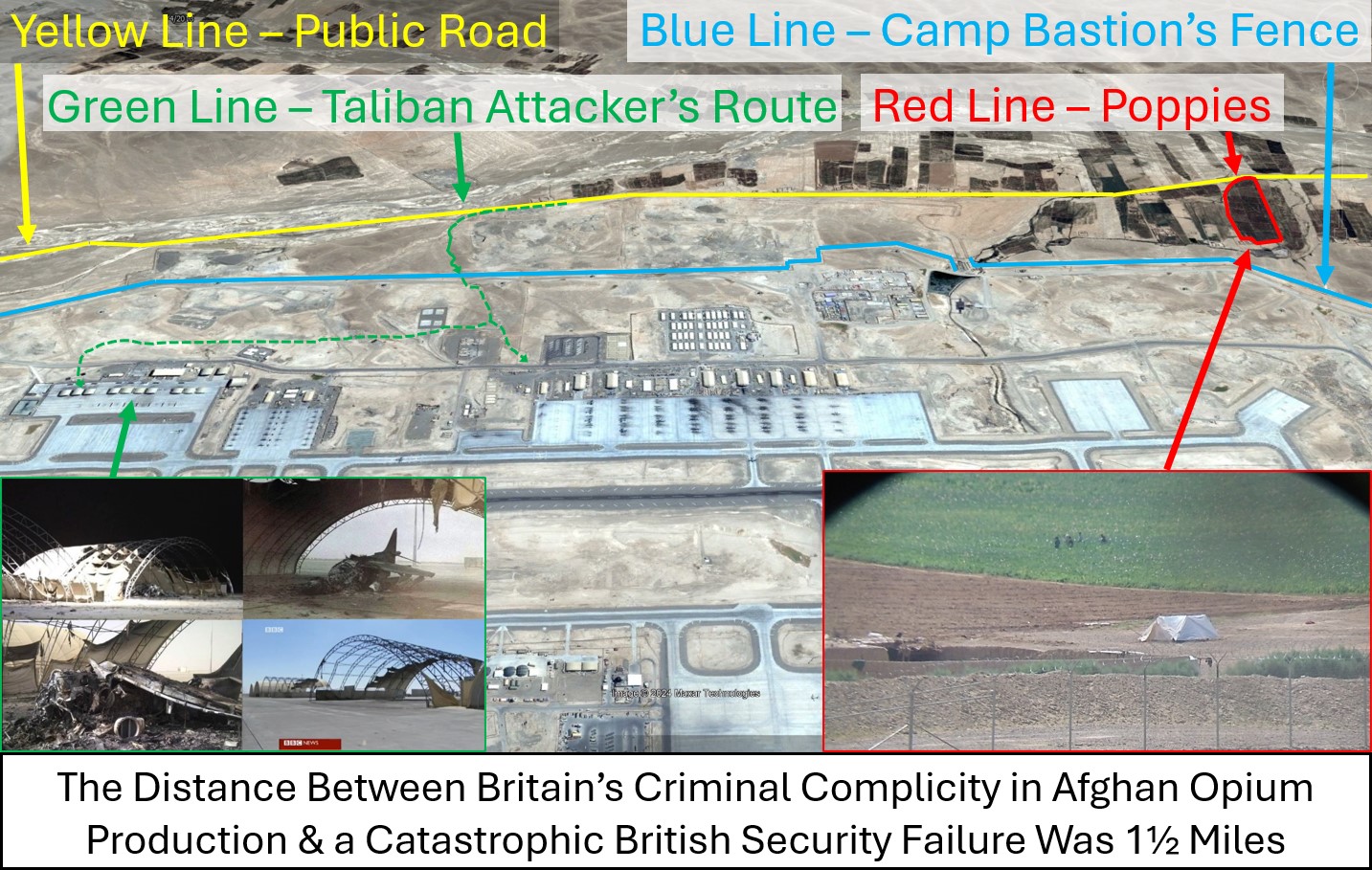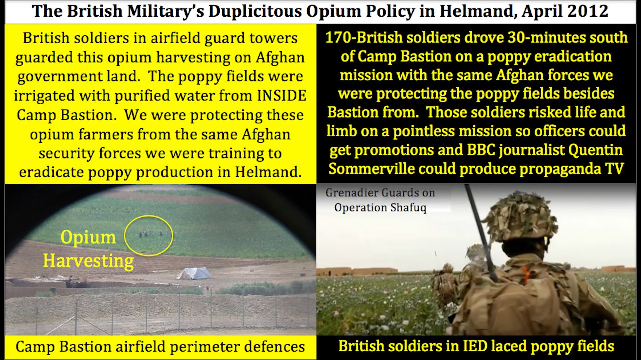 I’ve no doubt about British complicity in Afghan opium production because that was my job on my first guard duty on Camp Bastion’s airfield in April 2012. My guard tower overlooked a valley on the base’s eastern perimeter with a small village and farmers’ fields encroaching on our defences. Our orders were to stop the Afghan security forces from harassing the farmers in the valley, farmers I was now watching harvest opium about 400-meters from our fence line. As if that wasn’t enough, they were cooking the opium in full view of my guard tower and the poppy fields were irrigated by a water source inside Camp Bastion. NATO effluent literally made the poppies bloom! To make matters worse, on exactly the same day I was protecting opium farmers next to our base, 170-British soldiers were sent on a poppy eradication mission 20-km away. They had dutiful BBC journalist Quentin Sommerville embedded with them, to report our ‘poppy eradication’ efforts back home. This all occurred under Richards command.