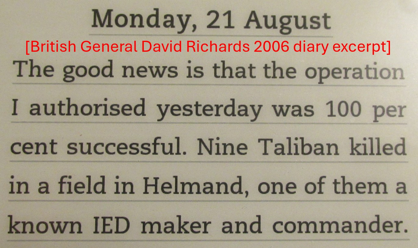 Richards Afghan command (2006/07) preceded Frank Ledwidge’s tour so I can’t link him directly to Ledwidge’s assertions but they do show extra judicial killings (EJKs) were a reality among NATO forces in 2007/08, if not earlier. This 21 August 2006 diary entry by Richards, when you understand military euphemisms, more than hints at executions rather than combat deaths: