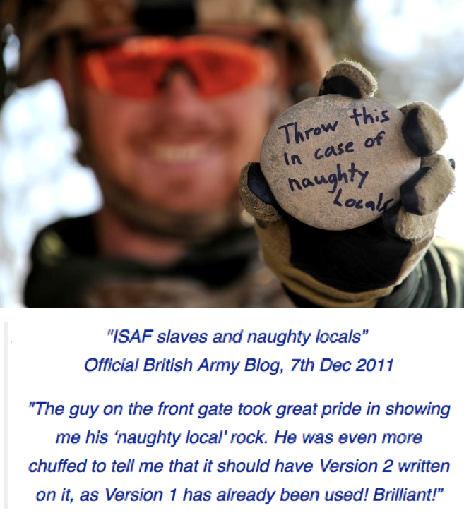 British army tactics to stop Afghan children harrassing our vehicle patrols did not work - that's why the kids were still stoning and robbing us in 2012. During one of the five patrol briefings I attended we were told if stones didn't scare the kids we should fire mini-flares (incendiary munitions) so they 'bounce off the floor next to them' , and if that didn't work to threaten them - children - with loaded pistols. The offensive use of incendiary munitions is a War Crime and although I only heard that order once and never saw it carried out, I have heard two confirmable reports of British mini-flares being fired as warning shots towards Afghan civilians. One was fired towards an Afghan male walking with a wheelbarrow towards some British soldiers, the other was at a civilian vehicle that got too close to a British military vehicle. The videos below show the inaccuracy of mini-flares and an American Special Forces soldier describing the horrific injuries one child suffered after being hit in his stomach by a mini-flare. The Americans were keeping him alive in their medical facility but the wound wasn't healing and discharging him to local care would have been a death sentence because of infection. The American said the flare had been fired because the boy, Muhammad, had been playing football in the street; he says the flare fired by a NATO ally hit a tree and 'bounced' down into the eight year old's stomach. I don't know what happened to Muhammad after that, whether he survived or not.