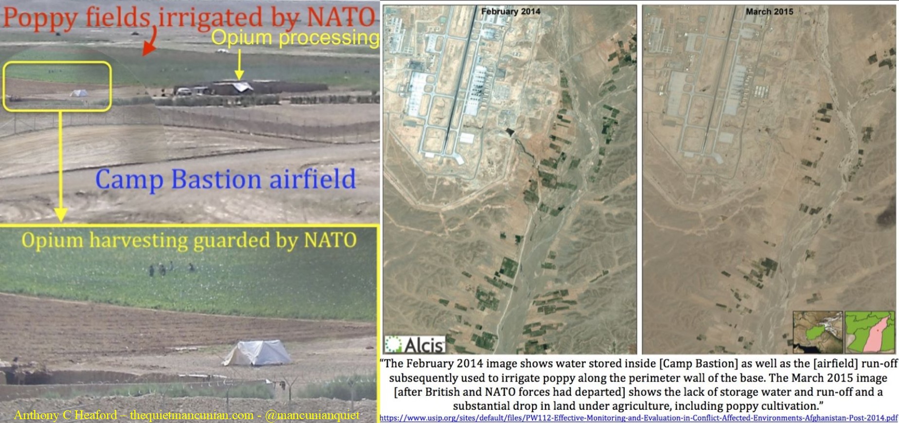 I’ve no doubt about British complicity in Afghan opium production because that was my job on my first guard duty on Camp Bastion’s airfield in April 2012. My guard tower overlooked a valley on the base’s eastern perimeter with a small village and farmers’ fields encroaching on our defences. Our orders were to stop the Afghan security forces from harassing the farmers in the valley, farmers I was now watching harvest opium about 400-meters from our fence line. As if that wasn’t enough, they were cooking the opium in full view of my guard tower and the poppy fields were irrigated by a water source inside Camp Bastion. NATO effluent literally made the poppies bloom! To make matters worse, on exactly the same day I was protecting opium farmers next to our base, 170-British soldiers were sent on a poppy eradication mission 20-km away. They had dutiful BBC journalist Quentin Sommerville embedded with them, to report our ‘poppy eradication’ efforts back home. This all occurred under Richards command.