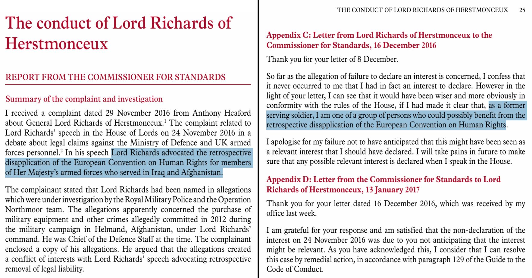 Baron Richards’ life-peerage still got him a well remunerated seat in the House of Lords, a position he abused in 2016 by asking for the retrospective disapplication of ECHR Law to recent British operations in Iraq and Afghanistan. Richards did that without declaring his interest: he commanded some of those operations himself. I reported that abuse of power to the House of Lords Commissioner for Standards and in 2017 Richards was compelled to apologize to the House, admitting his own liability for War Crimes prosecution. Richards admitted that: