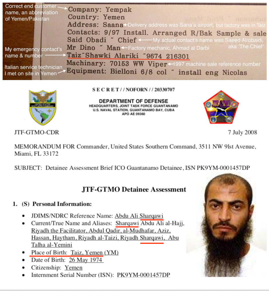 On Thursday 25 September 1997 Saeed Alrobaidi, managing director of Hayel Saeed Anam Group headquarters at PO Box 5302 in Taiz Yemen gave me a security contact name and number in case I had any problems while exploring the city. I noted my contact as ‘Shawki Alariki – 9674 216 301’. Shawki was my misspelling of Sharqawi and Alariki is Arabic for ‘caring leader’, my security contact’s job description. Al Qaeda had a local ‘fixer’ in 1997 Taiz called Abdu Ali Sharqawi; I think they're the same person.